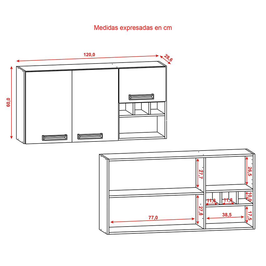 Mueble aéreo tres puertas:Alto: 60 cmAncho: 120 cmProf: 28 6 cmMueble bajo:Alto: 84 5 cmAncho: 120 cmProf: 51 8 cm