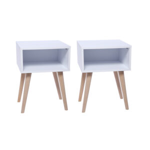 Set por 2 Mesas De Noche en melamina blanca en 15 mm con protección antimicrobiana al 99.9 % y patas torneadas en madera natural.