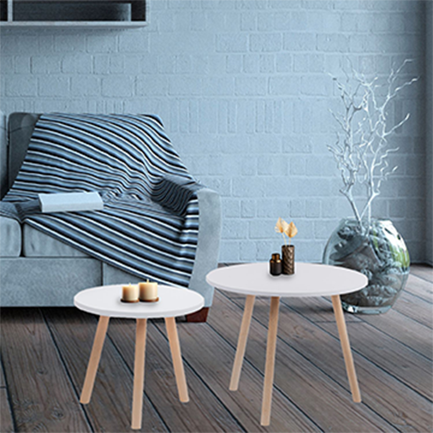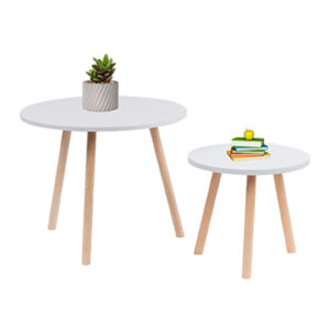 Set Mesas de Centro redonda color blanco. Fabricado melamina con protección antimicrobiana al 99.9 % y patas en madera color natural.