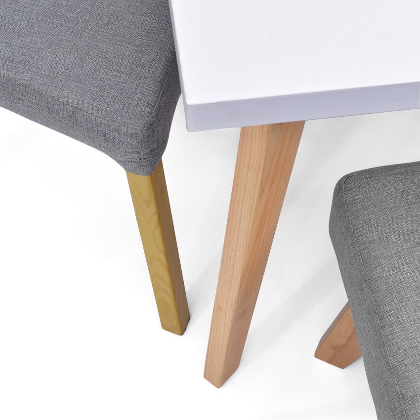 El Juego de Comedor San Marcos Royal cuenta con una base en madera pino y tapa de madera aglomerada pintada color blanco. Las sillas Anchieta están fabricadas en una fuerte estructura y patas metálicas pintadas acabado madera natural espuma de alta densidad en el espaldar y el asiento tapizado en tela poliéster de muy buena calidad.