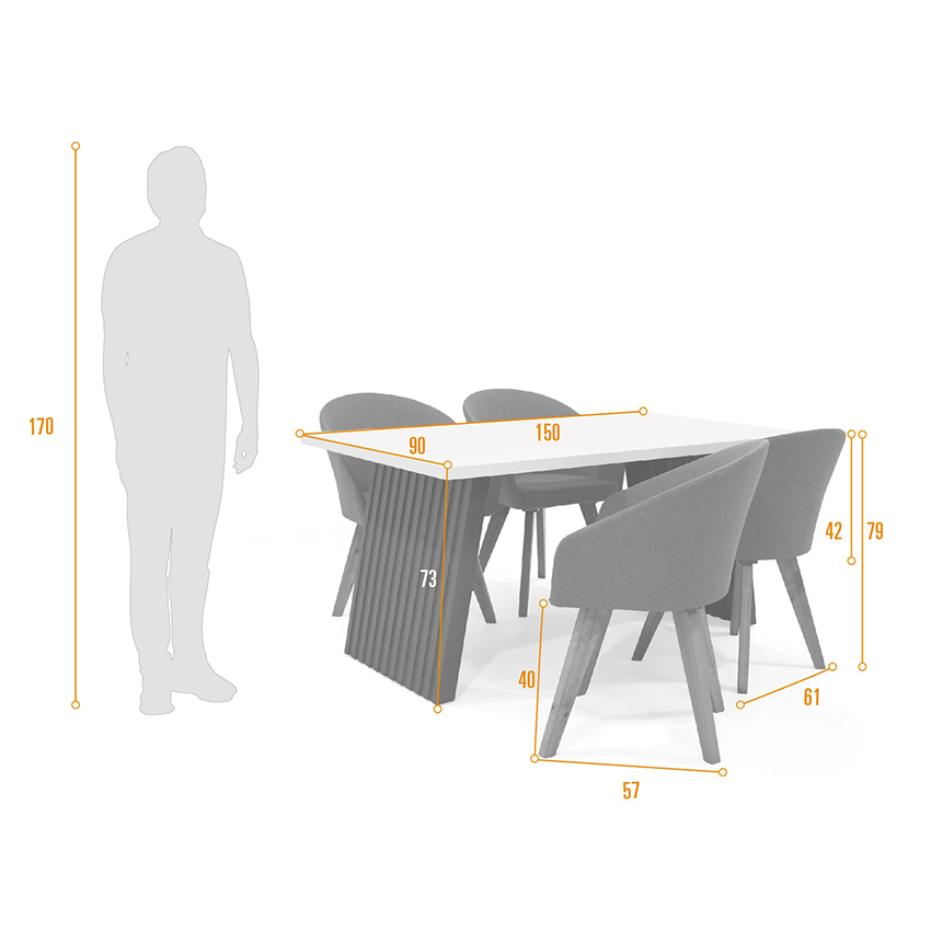 Mesa de comedor:Alto: 73 cmAncho: 150 cmLargo: 90 cmPeso: 42 kgSilla:Alto: 79 cmAncho: 61 cmLargo: 57 cmPeso: 6.7 kg